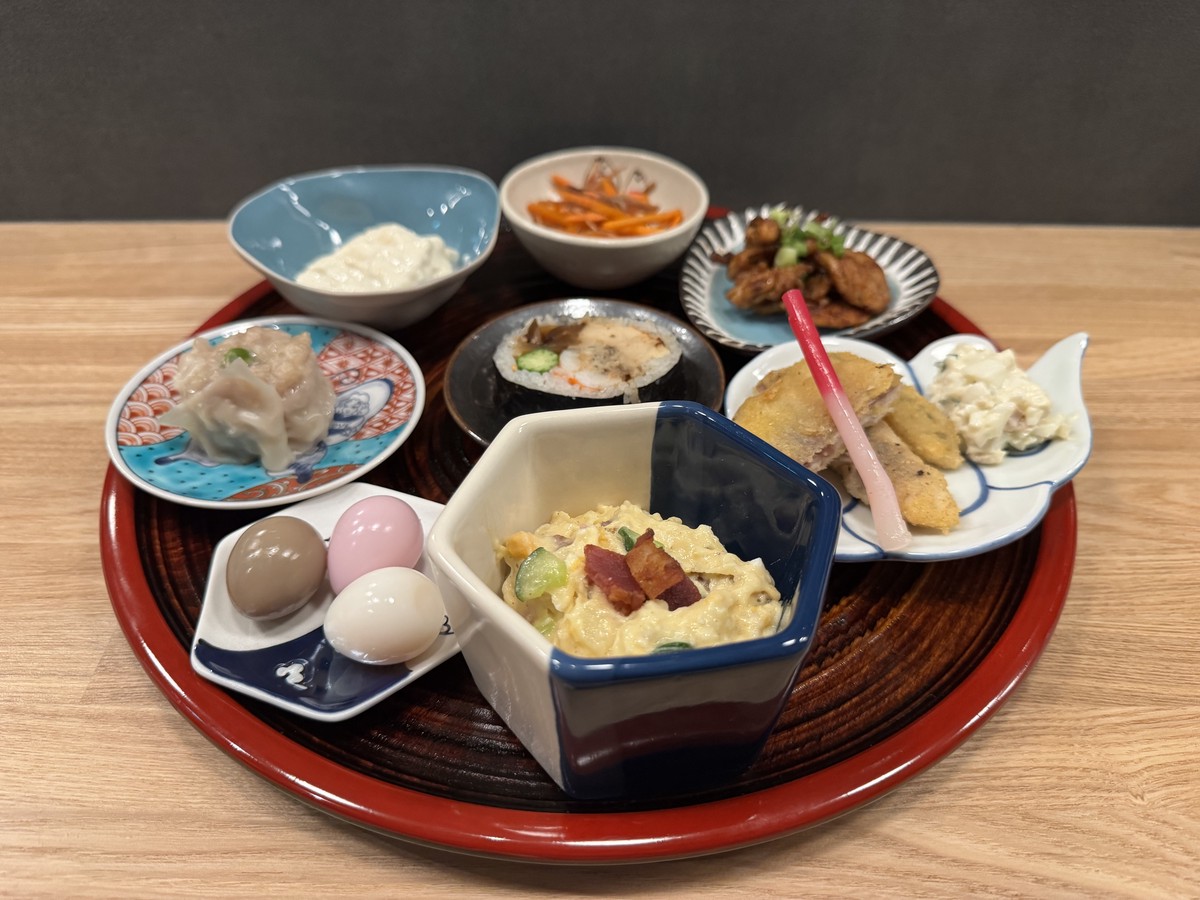 ●Appetizer Terrine of vegetables from our own farm ●Assorted Small Dishes(Obanzai) - Squid and carrots, a local dish from Fukushima - Grilled chicken neck with sweet and savory sauce - Lightly fried horse mackerel from Odawara - Japanese yam potato salad - Quail eggs trio - Spiced shumai dumpling - Fresh tofu from Ikebukuro’s Ohmomo Tofu Shop - Thick sushi roll from Sushi Shinji ●Main Dish Okonomiyaki made with Japanese yam ●Dessert Häagen-Dazs ice cream * Please note that the menu may vary depending on the day’s ingredients.