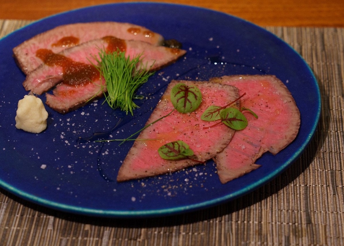 Starter: Champagne, Hiroshima Kajitani Farm Micro-Herb & OSMIC Tomato Salad, Wagyu Beef Cheek with Marmalade, Homemade Popover, Shiga Hino Turnip Potage, Wagyu Roast Beef, Kiln-Roasted Tamura Beef Steak – two-cut comparison of Chateaubriand and Rump, Homemade Hand-Crafted Pasta: Wagyu Bolognese, Hokkaido Cream Cheese Cheesecake, Coffee.