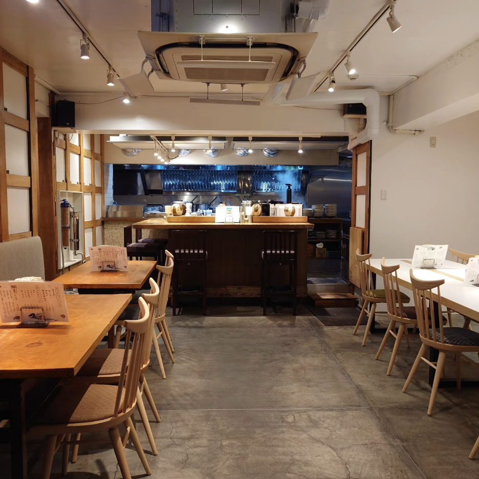 空席がありません人類みな麺類 東京本店は、大阪発の人気ラーメン店「人類みな麺類」の東京旗艦店として恵比寿・代官山エリアに位置するラーメン専門店です。化学調味料を使わない貝出汁ベースの醤油スープと、店頭製麺室で打つ全粒粉配合の太麺、そして「巨大な豚の角煮」のような極厚チャーシューが特徴。提供されるメニューは醤油ラーメンを軸に「原点」「micro」「macro」「骨」など複数の味わいがあり、それぞれのバランスで貝や魚介、鰹の旨味を楽しめる構成です。店内は木目を基調としたナチュラルモダンな空間で、カウンターとテーブルが混在し、一人客からグループまで使いやすい造理になっております。