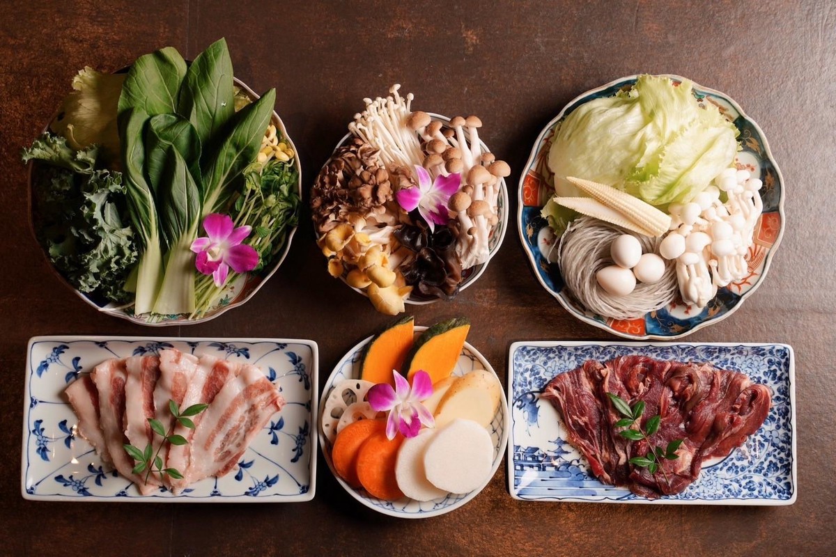 ・薬膳麻辣スープ&薬膳きのこ白湯スープ ・本日の小鉢(例:薬膳スープを使った茶碗蒸し、自家製ナムル盛り合わせ) ・お野菜きのこ盛り(約15種)※日によって種類と数が変わります ・お肉盛り(豚肩ロース、豚バラ、鶏もも、水餃子、自家製軟骨入り肉団子) ・〆の麺(麺道はなもこしさんに特別に製麺してもらっている自家製麺) ・月替わりの自家製デザート ※上記に加えて和牛が提供されますが、ご希望の場合ラム肉に変更可能です。 ※当日の変更はできないので、予約時の備考欄でご連絡頂くか、予約日の前日までに店舗に電話で変更連絡をお願い致します。