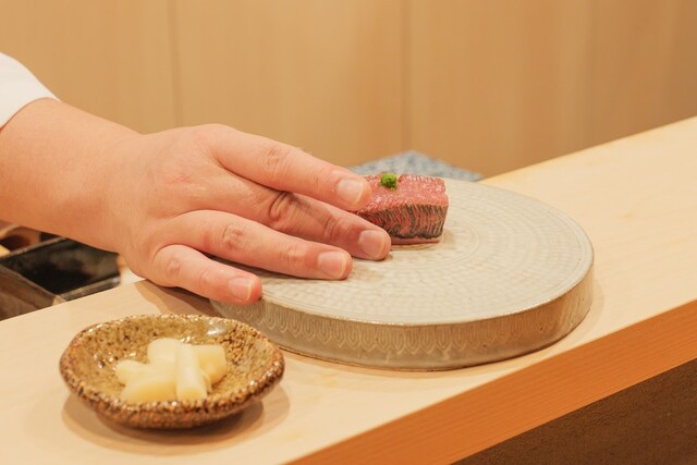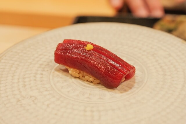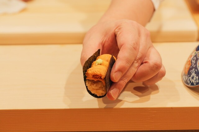 大将オリジナルの赤酢しゃりと、厳選したネタで握る自慢の鮨。 様々な舞台で活躍した大将の全てを詰め込んだ渾身のコースをご用意しております。 会食やデートでも、大将との会話が弾むこと間違いなし。 お酒を飲まれないお客様にはティーペアリングもご用意しております。