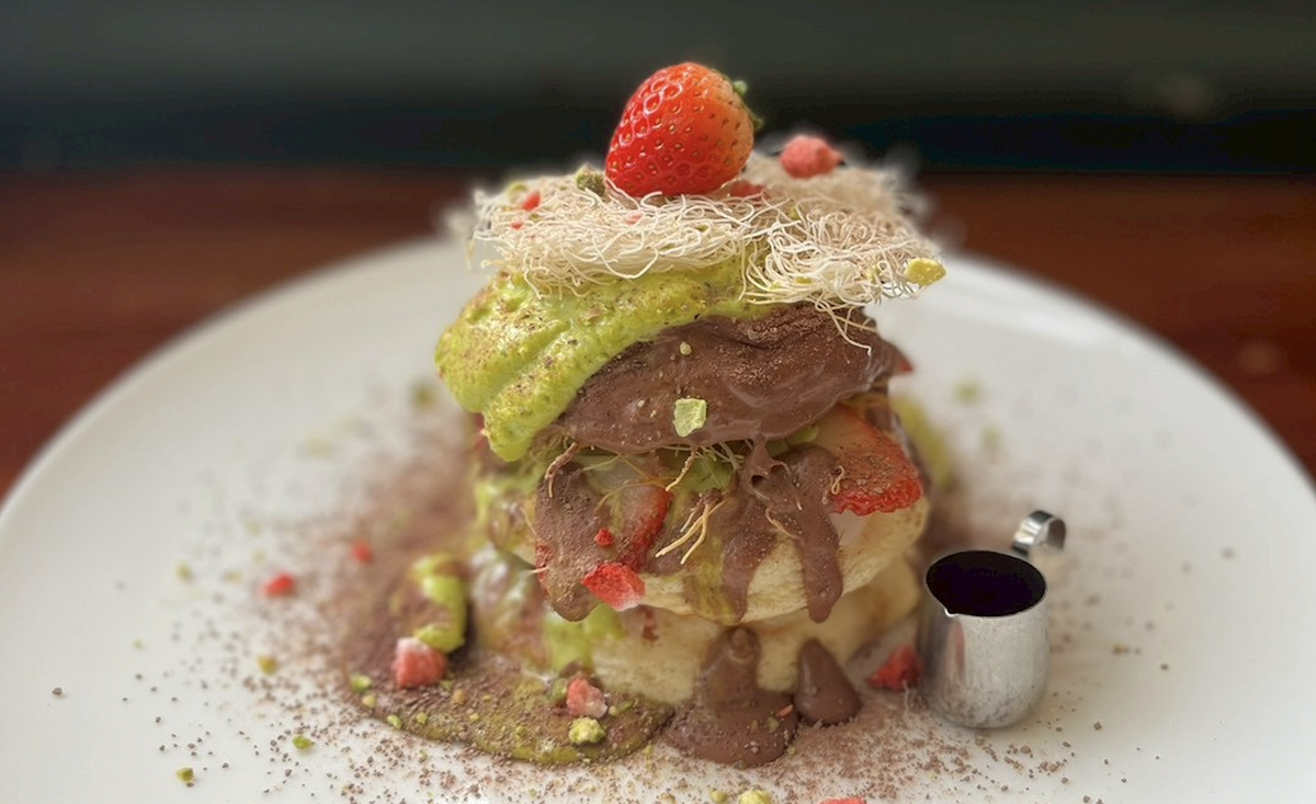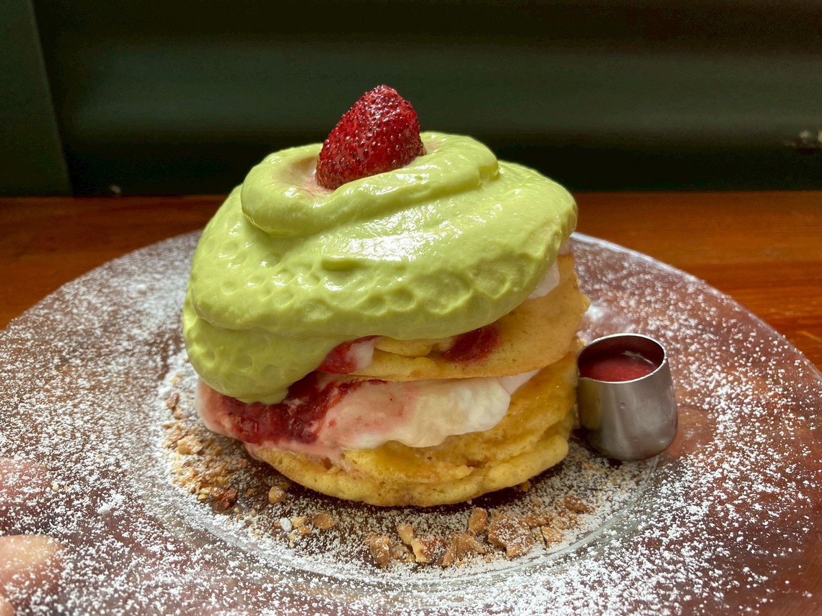 ふわふわグルテンフリーな米粉パンケーキに濃厚なピスタチオエスプーマにダークチョコレートソース、フレッシュな苺、サクサクなカダイフ、濃厚カスタード、ローストピスタチオ、フリーズドライフランボワーズ、別添えにフレッシュ苺ソースで様々な味わいと食感をお楽しみ下さい (お飲み物もセットです)