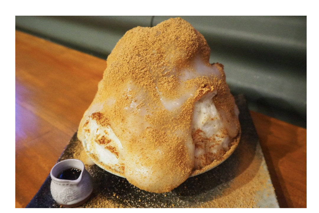ふわっふわなかき氷の上に、もっちもちの求肥と程よい塩味と香ばしさの自家ブレンドきな粉を溢れるほどトッピング。 かき氷の中には、お店で炊き上げる北海道産のあずきと黒豆にサクサクの黒ゴマクッキーのアクセント。別添えの抹茶ソースと黒蜜をお好みで。ビネフル名物の逸品です。 (お飲み物もセットです)