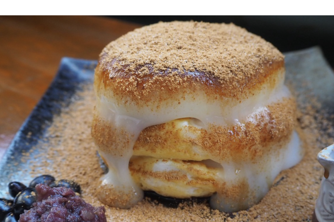 しっとりふわふわ食感の米粉のパンケーキに、もちもち求肥を層(とろっと)乗せて、香ばしい風味とほんのり塩気の自家ブレンドきな粉をたっぷり上から振りかけました。お店で炊き上げる北海道産のあずきと黒豆や、濃厚な黒蜜で味の変化を楽しめるビネフル名物のパンケーキです。 (お飲み物もセットです)