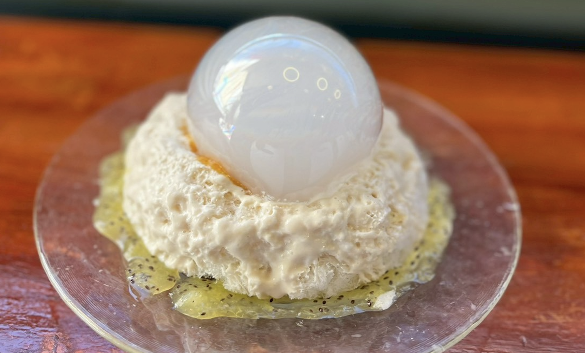 北海道産のクリームチーズ、サワークリームを合わせたふわふわ濃厚なクリームチーズエスプーマの上に、純ココアパウダーをたっぷり振りかけました。中には深入りコーヒーソース、クリームチーズエスプーマに香ばしいビスケットと甘酸っぱい苺のコンフィチュールを合わせました。 (お飲み物もセットです)