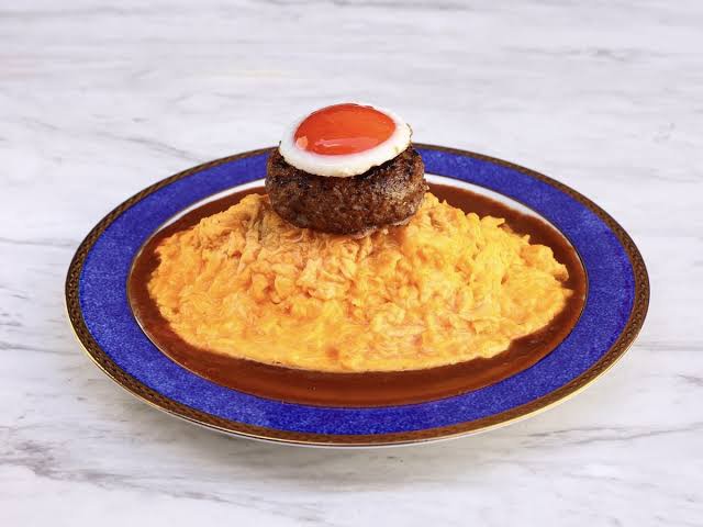 "Pakkan" Open-Style Omelet Rice with Triple Hamburg Steak (Demi-glace Sauce), One Drink (Iced Coffee, Iced Tea, Orange Juice, or Sanpin-cha), and Basque Cheesecake (Half-size)