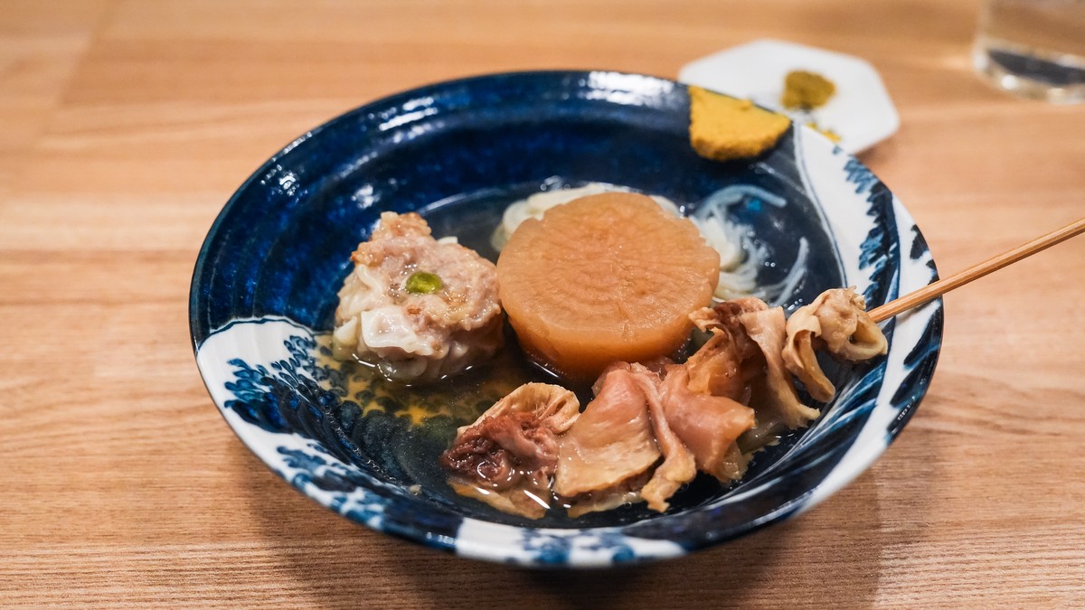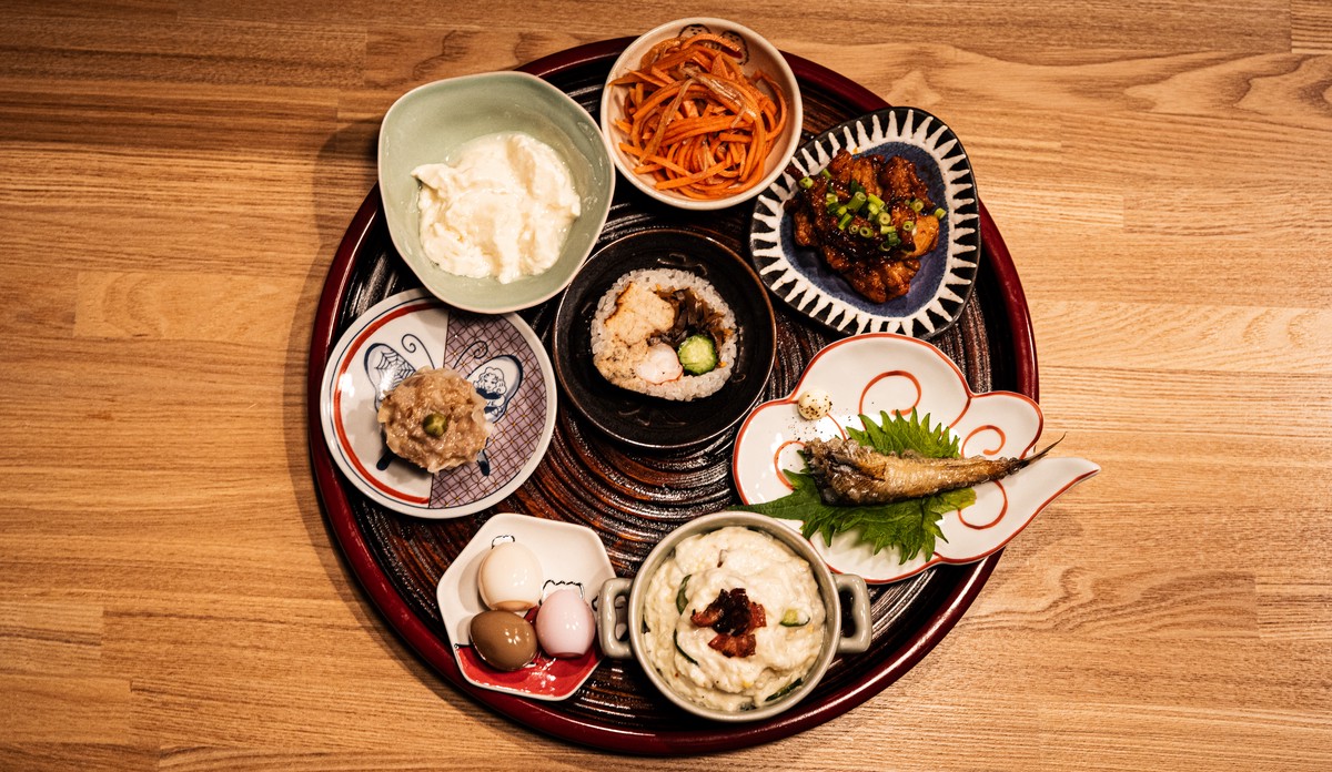 · 전채요리 자사 농원 채소로 만든 테리느 · 오반자이(일품 소반 요리) 후쿠시마 향토요리 ‘이카닌진’(말린 오징어와 당근) 닭 목살(세세리) 단짠 양념구이 하룻밤 말린 후쿠시마산 메히카리 참마 감자샐러드 메추리알 3종 모둠 스파이스 슈마이 이케부쿠로 오오모모 두부집의 요세도후(부드러운 순두부) 스시 슌지의 후토마키(두꺼운 김말이) · 메인 참마 오코노미야키