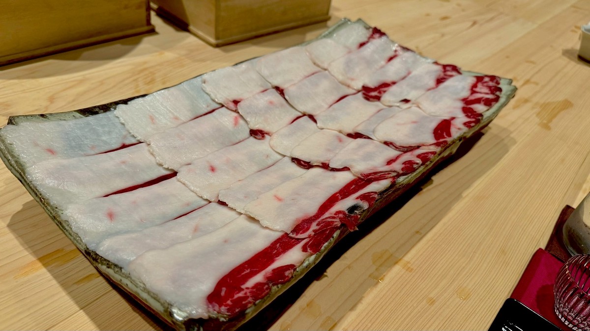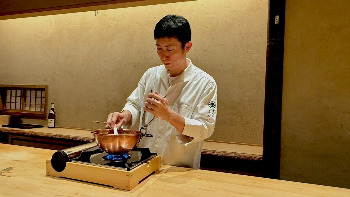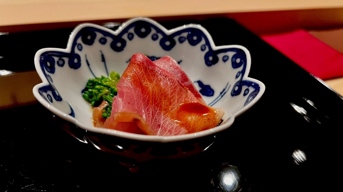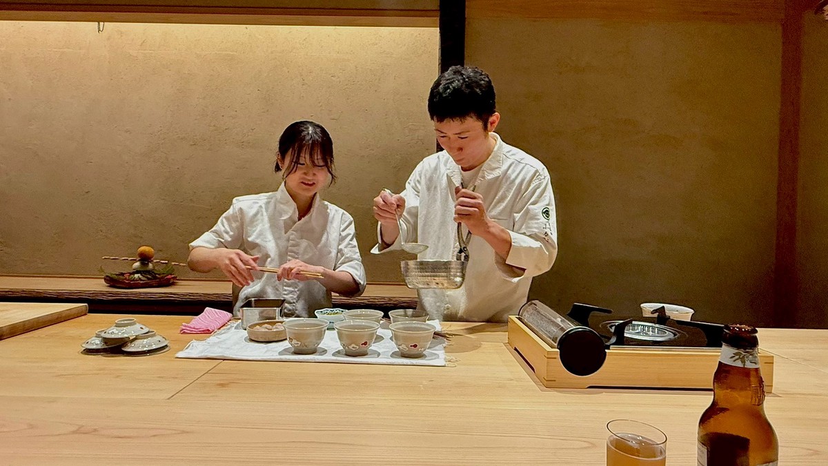 Tucked quietly behind the popular Karasuma restaurant Jizakana Shokudo Tainotai, this intimate Japanese restaurant offers just eight counter seats. Upon entering, guests are welcomed by a dignified single-slab hinoki cypress counter, setting the tone for a serene and refined dining experience. Chef Furukawa honed his craft at Kyoto’s renowned Sangentea (山玄茶), and presents Japanese cuisine that highlights the inherent flavors of each ingredient with minimal seasoning. The dashi is prepared using spring water from the UNESCO World Heritage site Shirakami-Sanchi, lending a pure, gentle clarity to every dish. Rice is sourced as brown rice and milled daily in-house, resulting in a bowl with exceptional aroma and crystalline texture. The course reflects Japan’s seasonal transitions and cultural traditions—featuring hassun that expresses the time of year, delicately charcoal-grilled hamo (pike conger), and freshly prepared warabi mochi, among other refined offerings. The unified height of the counter and preparation space allows guests to experience the culinary process up close, adding to the immersive atmosphere. Tableware is also thoughtfully selected to complement each dish and season, including pieces such as Karatsu ware and Hagi ware. Here, cuisine and ceramics resonate in quiet harmony, creating an elegant and contemplative dining experience.